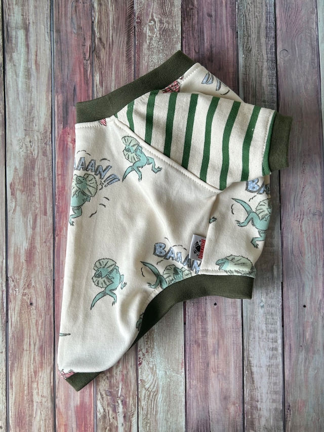 タフタフ仲間?! かわいいエリマキトカゲのお洋服です。 袖付きは緑色のボーダー生地を組み合わせています。 タンクトップ、袖付きともにリブを一色お選びいただけます。オプションタブより選択してご注文ください。 【リブ】杢グレー、ディープグリーンから一色選択 【伸縮】あり 【生地】スムースニット 【デザイン】タンクトップ、ラグラン袖付き(+300円) ★サイズ調整は有料オプションとなります。 (現在、サイズ調整はリピーターの方のみ受け付けております) 【その他ご確認事項】 ●ご注文いただいてから製作いたしますので、発送まで7〜14日程度かかる場合がございます。 ●お手入れは手洗いをお勧めいたします。 ●柄の出方は裁断の位置で異なります。 ●商品の画像はお客様がご覧になっているモニターや画面環境などによって、実際の色味と異なる場合がございます。あらかじめご了承くださいませ。 ●生地やリブにプツプツとネップが含まれている場合がございますが、洗濯で徐々に落ちていくものですのでご安心くださいませ。 ●メールアドレスの間違いが増えております。ご注文の際は今一度ご確認をお願いいたします。